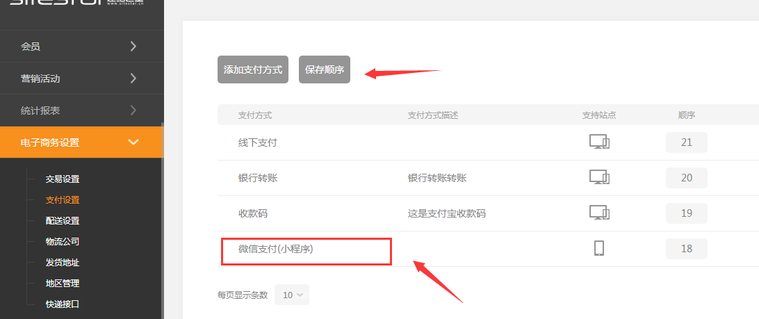 ①.后台---电子商务设置--支付设置里,可以添加支付方式。微信支付指的是前台生成填写的设置,这里会同步前台的填写内容