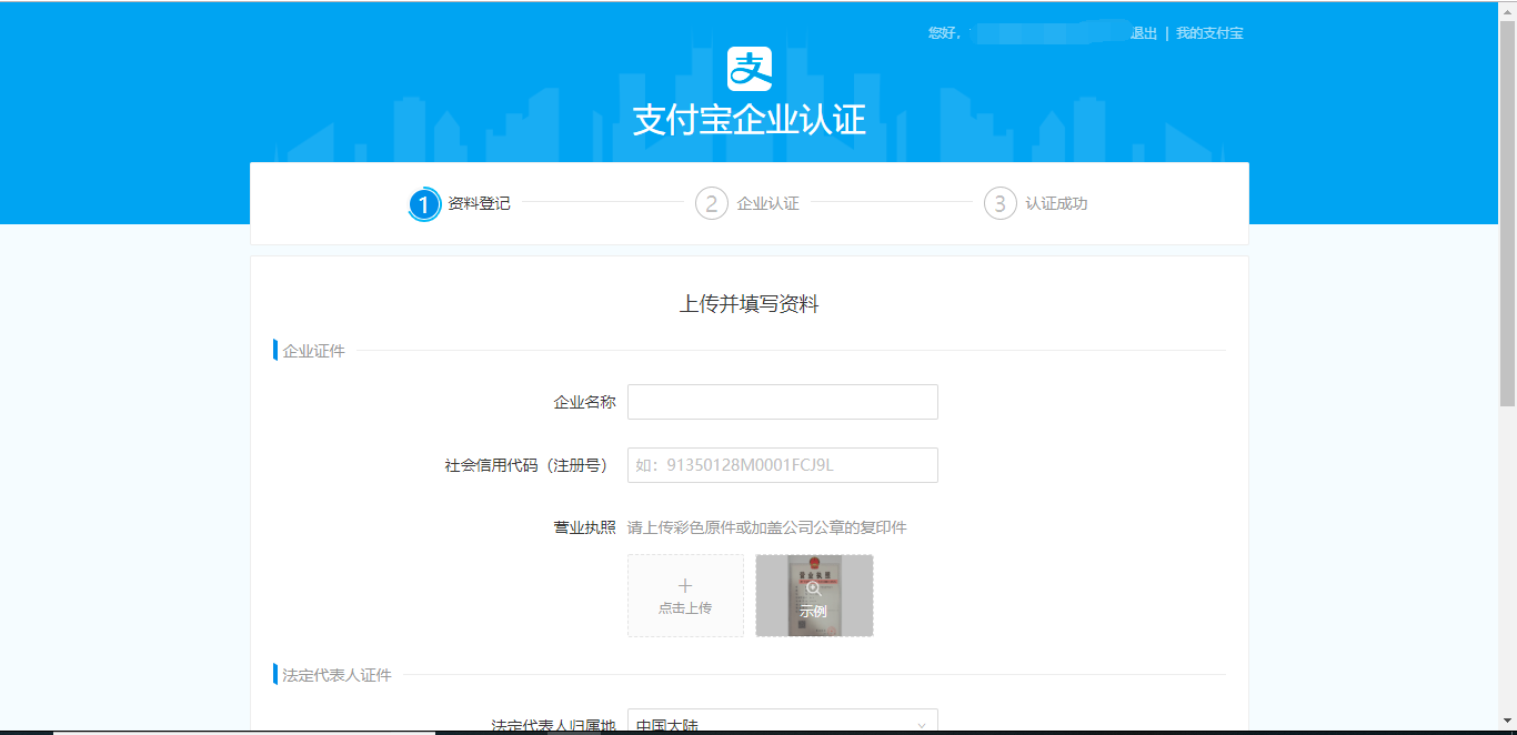 注册账号填写邮箱账号后,在邮箱中会收到一封邮件,点击“继续注册”,填写完所有信息后会出现“企业实名填写页面”,点击进入,填写信息通过认证即可,如图所示:
